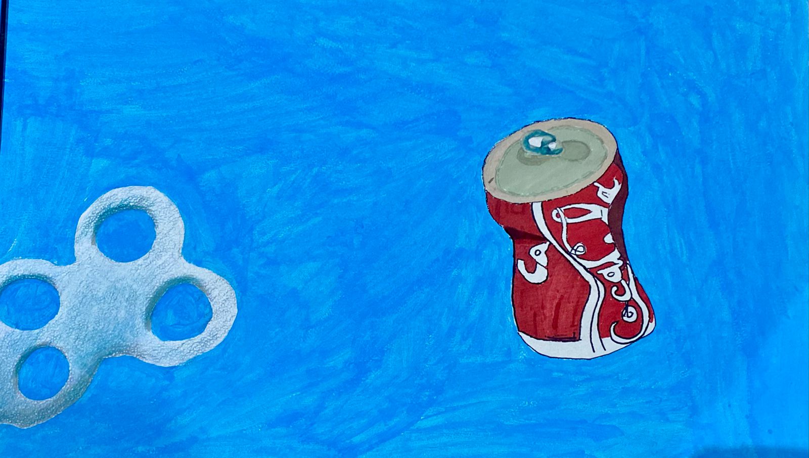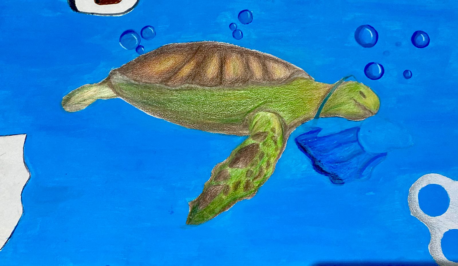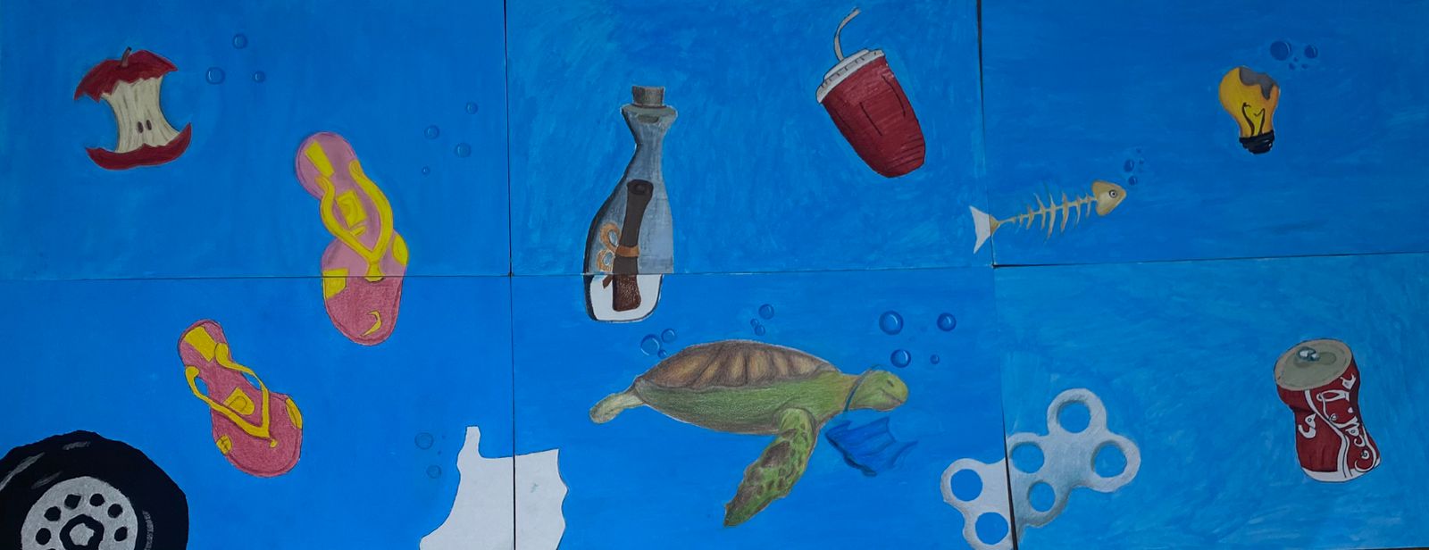 Para representarlo de mejor manera en el centro aparece una tortuga rodeada de basura como bolsas de plástico, latas, anillos de plástico de latas de cervezas, manzanas mordidas, llantas, chanclas, botellas de vidrio con papel adentro, peces muertos, focos rotos y vasos desechables. Estos objetos son cosas que usamos todos los días y que terminan tirados en la calle, mares o incluso en la escuela.