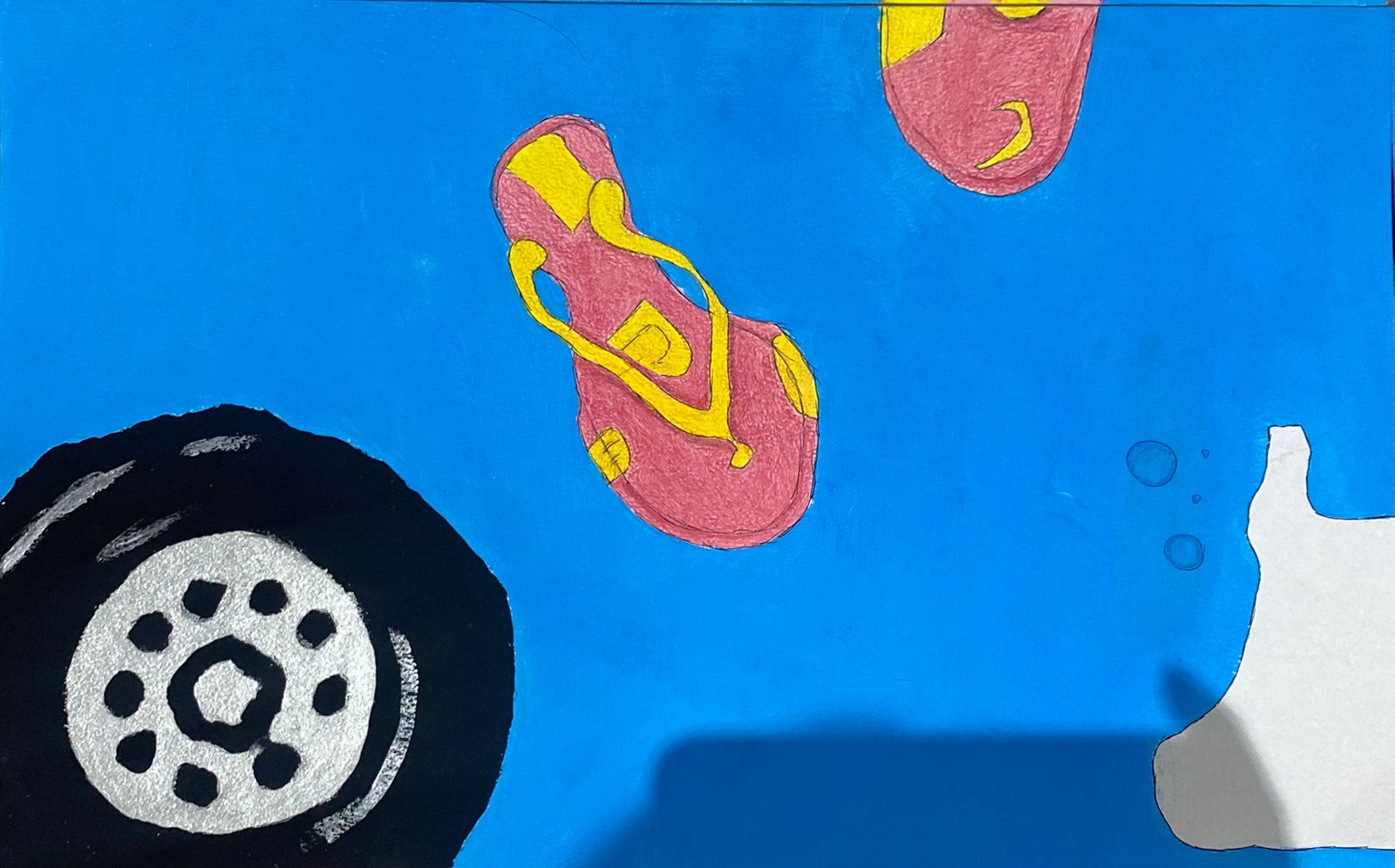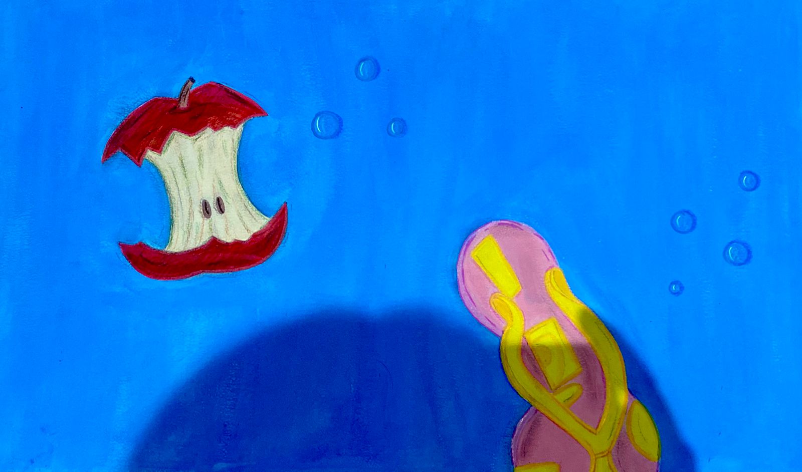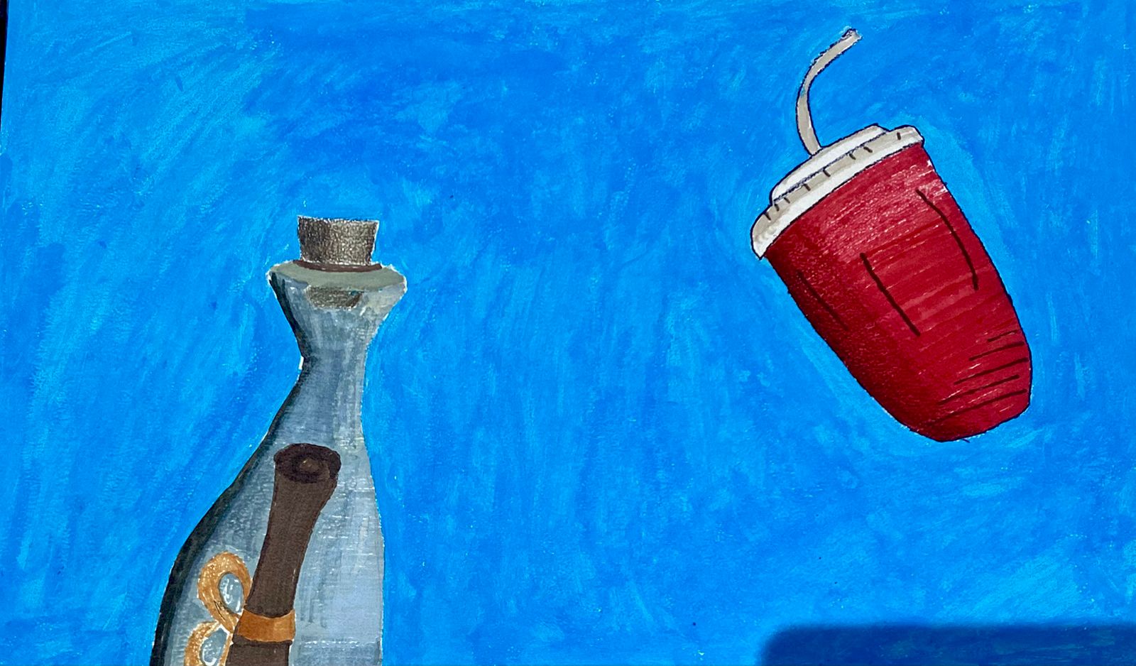 Para representarlo de mejor manera en el centro aparece una tortuga rodeada de basura como bolsas de plástico, latas, anillos de plástico de latas de cervezas, manzanas mordidas, llantas, chanclas, botellas de vidrio con papel adentro, peces muertos, focos rotos y vasos desechables. Estos objetos son cosas que usamos todos los días y que terminan tirados en la calle, mares o incluso en la escuela.