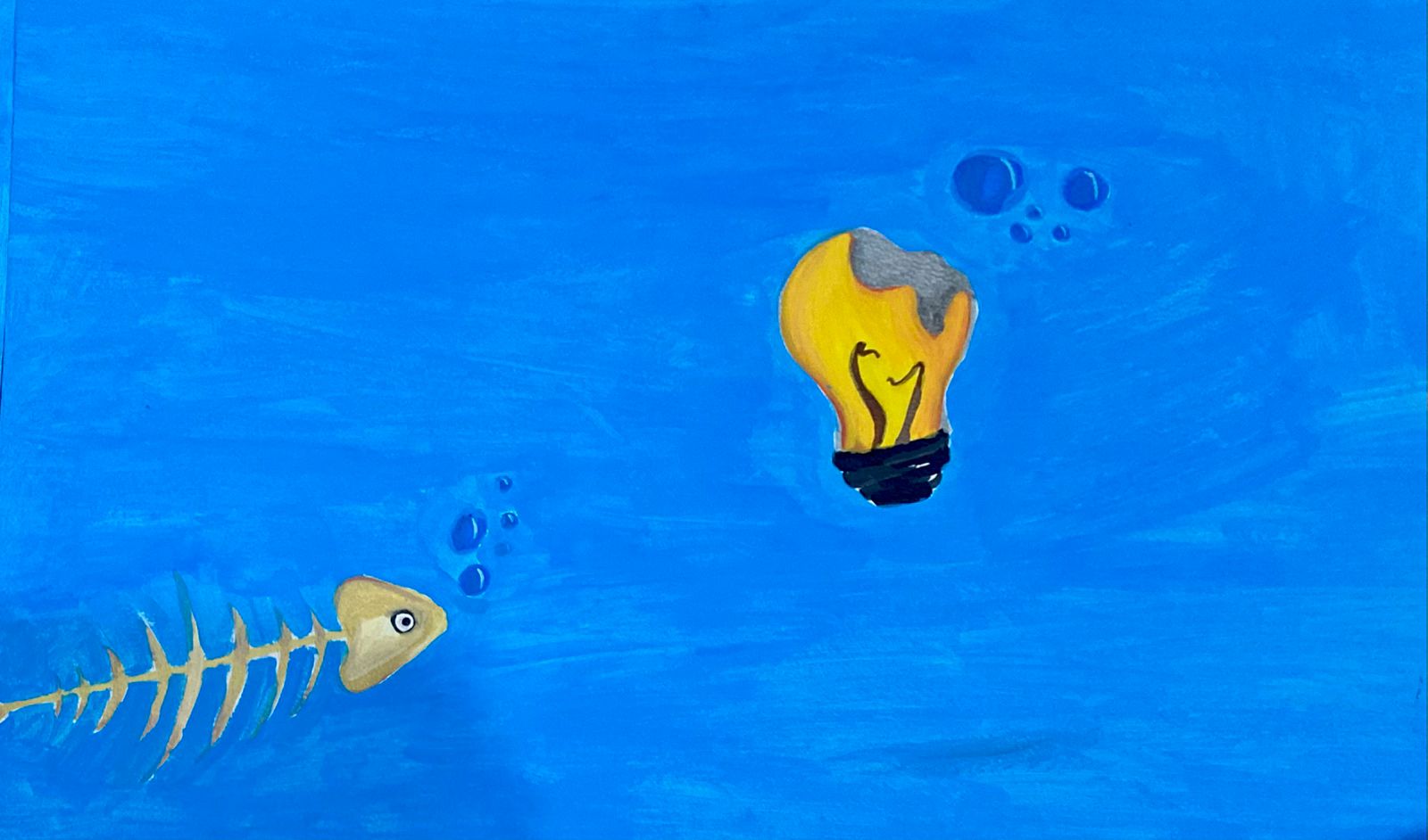 Pescado muerto con huesos: Ilustra las consecuencias de la contaminación, como la muerte de animales por ingestión de plásticos o exposición a tóxicos.